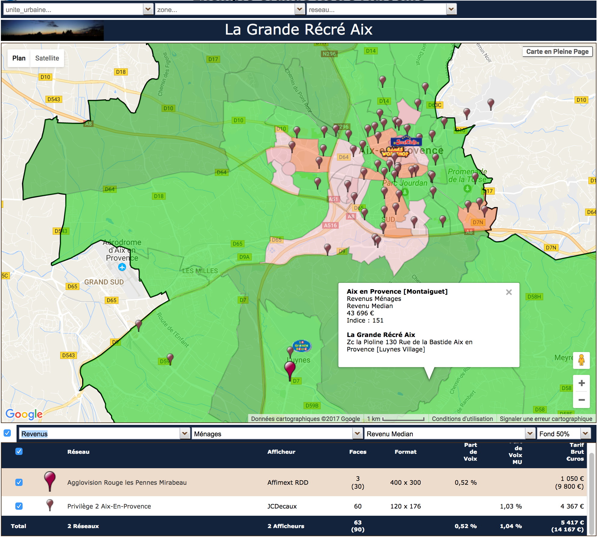 La base de données recense plus de 120 afficheurs sur l’ensemble du territoire français et comprend environ 400 000 faces géocodées + 100 000 faces localisées (sans adresses en tant que telles; comme le bus, mes intérieurs de train, etc). Le logiciel permet simplement de superposer l’offre à la demande formulée généralement sous forme de territoire géographique.